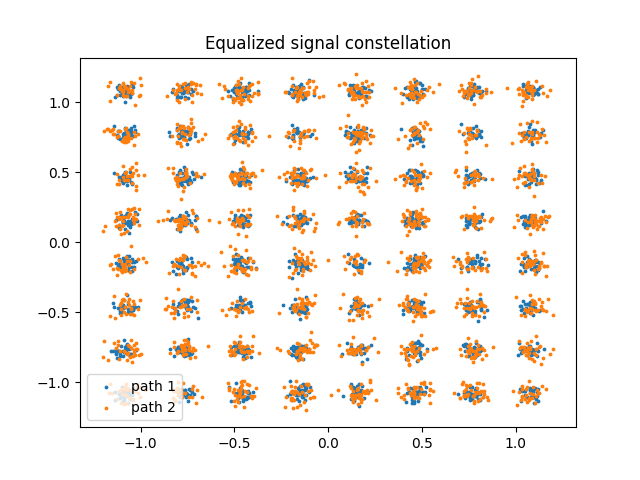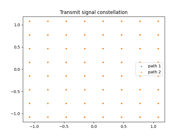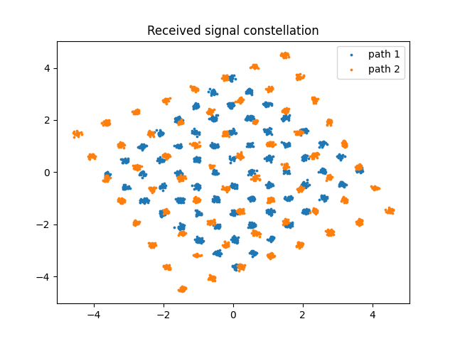 Following is an example with 64QAM signal being transmitted over 2×2 MIMO channel. In this toy example, the channel is a randomly generated time-invariant 2×2 matrix with a condition number of 2.97. Transmit signal constellation is normalized to have unit mean power. Thermal noise at the receiver is modeled as an AWGN channel with 10dB SNR for an input signal with unit power.